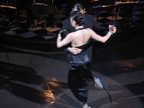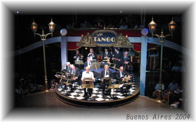 さて、まあまあ美味しい食事の後、いよいよショーが始まった。タンゲリーアでタンゴダンスだけを観てみたかった私にはショーアップしすぎの感があったが、ダンサーもオケも歌手も、一流だということは分かる。特に気に入ったのが、ラストに近くなってから出てきた、オーケストラのベテラン勢だ。トップの写真の人たちがそうなんだけど、これはスゴかった。呼吸を合わせて、一斉にバーンと曲を始めるところなど、職人技というか芸術的というか・・・。私は思わず指揮者を探したほどだ。このオジサマたちのおかげで、私にとってのタンゴは、ダンスでも歌でもなく、オーケストラそのものになったのだった。 |