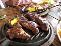 時間ギリギリにホテルに戻り、私が買ったものを部屋に置きに行き、戻ってきたらラファエルと弟さんが既に到着していた。タクシーに乗って、ラプラタ川近くのレストランに入る。彼らが選んでくれた料理は、とても美味しかった。肉も、内臓の部分の盛り合わせなんかあったりする。モツを食べる日本人にとっては、そんなところにも親しみを感じてしまう。入ったときには空いていたレストランが、どんどん混んできて、「早めに来て良かったね」というくらいになった。 市内観光の時間が近付いてきたので、全部食べ切れなかったんだけど、途中で私たちだけ帰ることに。タクシーを捕まえるとこまで付き合ってくれたラファエルに、だんなはスペイン語で「またね」と言おうとしたが、"アスタ"の後が出てこない。タクシーの運ちゃんに助け船を出してもらって、やっと"アスタ・ルエゴ"と言えたのだった。ホテルに着くまで、運ちゃんと通じないながらもスペイン語で話す。悪路にハマり体が宙に浮くと「道がデコボコしててねえ」などと言っているのは、なんとなくわかる(笑)。"See you tomorrow"は"アスタ マニアーナ"だとか、いろいろ教えてもらい、最後は"ブエノスアイレスより新年おめでとう!"と言われる。なかなか楽しい時間を過ごせた。オジチャン、ありがとう。