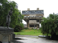 時間ピッタリにロビーに着いたはいいが、お迎えがなかなか来なくてイライラ。約1時間後にチャキチャキした感じの女性が恐縮しながら姿を見せた。道がすごく混んでいたらしく、それは仕方がないことだけど、こんなに遅くなるなら・・・と、食べ損なった料理にかなり未練を感じてしまった。 ガイドのオネエさんは、スペイン語と英語の両方を使って説明するので、弾丸のようにしゃべりまくっていた。道路の渋滞で遅れたことを詫びた後、あちこちでデモがあり、現在5月広場とカミニート付近は、車の出入りを封鎖しているとか言い出した。レコレータ地区を車上でガイドした後、ペロン大統領時代に官邸だったところで、現在は図書館になっている建物の前で写真撮影の時間を5分与えられた。建物の前にはエビータの像がある。故ペロン大統領夫妻は、今でもアルゼンチンの人たちに愛されているようだ。エビータは、モナコの故グレース王妃みたいなものでしょうかね。