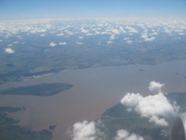 飛行機の席が窓際だったので、ラプラタ川などの荒々しい景観を楽しむことができた。いつもは通路側を選ぶ私たちだが、南米はアンデス山脈など上空からの眺めが素晴らしいので、窓際の席の方がオススメである。イグアスへは、昼過ぎに到着。空港からはタクシーに乗ってシェラトンホテルへと向かう。運ちゃんは、ブラジルで3時間、アルゼンチンで5時間の観光を見込んだ方が良いと言う。ビザがないのでブラジルには行けないと言うと、滝を見るだけなら問題ないと言う。190ペソで明日ブラジル側を観光しないかと言われるが、即決できないので運ちゃんのケータイの番号だけ教えてもらった。ホテルでチェックインした後、ATMでお金を下ろし、とりあえず荷物を置きに部屋へ向かった。キャリーオンギリギリのカバンに入り切らない洋服を着て移動したため、さっそく薄着に着替える。そして、一応濡れても良い格好になってから出発したのであった。