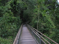 Jungle(第二のジャングル)なのだとか。密林時代には光が入らずに生えることができなかったであろう竹が、現在はあちこちに茂っていることが、再生中である印ともなっている。また、この辺りのローカルな木であるアンバイには、薬効成分があるとのことだ。 様々な説明を受けてトラックはビジターセンターに到着。このまま乗っていればホテルまで連れて行ってくれるのだが、私たちはこの後、悪魔の喉笛まで電車に乗って行きたかったので、ここで降りた。公園内の鉄道は、国立公園の入場料(タクシーでホテルに向かう途中に払った)に含まれている。終点まで、のんびり乗車。そして遊歩道をてくてく。10分くらい歩いていくと前方に水煙が見えてきた。