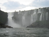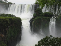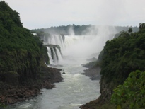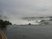 すごい水量の悪魔の喉笛は水飛沫が半端じゃなく、生乾きだったTシャツがじっとり濡れて、元の木阿弥になってしまうほどだった。先ほどボートから見上げた滝を、今度は見下ろしているわけだが、なんかもう、霞んでよく見えん(苦笑)。デジカメも、とてもじゃないが出すことができず。ここで故障させるわけにはいかないので・・・。それでも2〜3枚撮ってからポケットに仕舞い、自分が濡れるのは全く構わなかったので(だって既にびっしょりだから)、写真が撮れない分、目に焼きつけることにしたのだった。 |