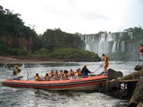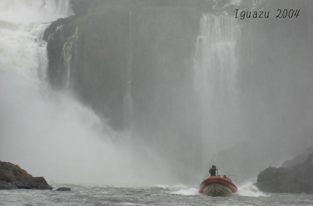 最初に、向かって右手にある滝に向かい、ベストポイントで滝をバックに写真タイム(有料)、その後悪魔の喉笛へ。喉笛手前の細い滝で、さっそく洗礼を受ける(ぎゃー)。濡れるというより、思い切り水をかぶってるんですけどっ。その後、先ほどの滝まで戻り、なんと3回も滝に打たれる羽目に(泣)。最後は「もう止めて〜っ」と叫んでしまった。びしょびしょ。パンツまでびしょびしょ。面倒臭がって、水着に着替えなかったことを深く後悔(苦笑)。 その後、ボートは滝に続いている川をすごいスピードで走り、行きとは違う船着場に到着。係員のオニイさんが「楽しかった?」と濡れネズミの私に、ニッコリ微笑みかけたのだった。 |