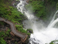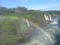 悪魔の喉笛近くの遊歩道は、昨日と同じく水飛沫がスゴイので、なかなかカメラを取り出すことができなかった。今回はあまり濡れるわけにもいかないので、持ってきたレインコートを着て凌ぐ。最終地点は、悪魔の喉笛を真近で見上げることができる展望台になっており、そこからも虹が・・・。係員のオジサンも、ニッコリ私に笑いかけて「レインボーッ」と指を差した。いやー。来れて良かった。もう、思い残すことはないわ(笑)。せっかくだからとTシャツを買い、滝の上部が見える辺りをウロウロした後、再びバスに乗って戻ったのだった。 |
