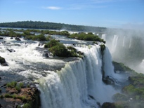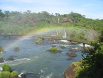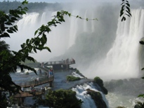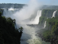 | ブラジル側は、イグアスの滝を少し遠めに見る感じ。その分全体を見渡すことができて、滝の雄大さを満喫することができる。昨日と違って青空が広がっていたので、より景色が綺麗に見えた。遊歩道も、ちょうど影ができていて歩きやすい。時間が経つと共にどんどん暑くなっていったので、午後は厳しいだろうなあと思う。この日は、あちこちに虹が出ていたので、それだけでも気分が良かった。 |