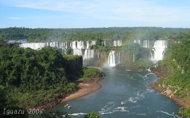 ●イグアス1(ブラジル側) '04年12月31日(金) いよいよアルゼンチン最終日である。先にチェックアウトを済ませ、急いで朝食をとる。ドライバーのオマーンさんがやってきたので、さっそくタクシーに乗り込んだ。パスポートを彼に渡し、検問所の手続きをお願いする。数分で無事通過することができた。結構な距離を走った後、9:00近くに到着。そう言えば、通貨はレアルだ。全く持っていないのでオマーンさんに任せる(買い物はドルでも大丈夫)。チケットをもらい、ここで一旦オマーンさんと別れ、カラフルなバスに乗り込み出発。ジャングルの中を行くので、眺めはなかなか良かった。15〜20分くらいして、やっと滝入り口に到着。ガイドブックには午後から、と書かれていた虹が綺麗に出ていたので、とても嬉しかった。 |