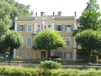 | クア・センターやトリンク・ハレを覗きつつ、老舗のカフェ、ツァウナーを探す。ここが、夏の間川沿いにお店を出すということで探してみたが、ないようだった。カフェ自体はケーキしかなさそうだったので、川沿いの中華料理屋で昼食をとることにした。ビールを飲みつつ、ふと対岸に目をやると大きな観光バスが止まっているのが見える。そこには、「メリー・ウィドウ」などのオペレッタを書いたレハールが、晩年に過ごした家があったのだった。 |