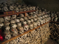 | マルクト広場で写真を撮った後、教会の中に入ってみた。指定席を示すのか、名前が刻まれた古いプレートがはめ込まれた席がある。内部の材質はほとんど木だったので、とても涼しげに見えた。教会を出て、ゆっくり散策している内に、カタコンベの案内板を見つけた。けっこう急な階段を登っていく。高台にあるキリスト教会から見る景色は、またとても美しかった。納骨堂は、更に登ったところにある。1ユーロ(だったかな?)払って中に入る。狭い空間に所狭しと骸骨が並んでいる。変わっているのは、頭蓋骨のおでこのあたりに絵が描かれていること。日付と名前も書いてある。