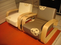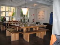 | 次に木製のアクセサリーや置物などがある「アーリッカ」へ。かなり悩んだが、ここでは何も買わず、今度は「マリメッコ」へ。地下1階にはテキスタイル関連やガラス製品などが売られ、もうステキなものだらけ。私は思わず布地を買ってしまった。テーブルクロスにするんだもーん。 ここまでは、困ったような顔をして付き合っていただんなだが、インテリア関連の店に行き始めてからは楽しそうにしていた。「アルテック」はフィンランド建築の第一人者アルヴァル・アールトがデザインした家具を扱う高級店で、椅子好きの私はまたもハマッてしまった。だんな憧れのイームズの安楽椅子に座ったりして、とても良い気分。 しかし、次に向かったインテリアの店「ワンダ」はなかった。仕方ないので、近くにあるレストラン「ヴィア」でお昼をとることにした。 ここは、新進気鋭のシェフ、ユルキ・スクラ氏のレストランで、オフィス街にあるせいか、スーツ姿のお客が多い。私はランチセットを注文。確かアーティ・チョークのサラダとチキンのグリル・パプリカ添え、メロンジュースにブルーベリーのクヴァルク(ヨーグルトを濃縮したような乳製品)だったと思う。すんごい美味しかった。入り口には各種スープの素やオリーブオイルなども売られていて、そのパッケージがまたステキ。ああ。私って都会が好きかも(笑)。 |