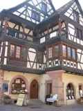 ●リクヴィル '04年6月6日(日) リクヴィルは、美しく彩色されたかわいい木組みの家並みが残る村。その中を、まず早朝に散歩した。村はブドウ畑に囲まれている。朝早くから開いているお店に入ってフォアグラを一瓶購入。これを、買ったワインとともに食すことにしよう。あちこち、ショーウィンドウを眺めながら歩く。とても小さな村で15分くらいで周れてしまう。どの角度から見ても絵になるので、たくさん写真を撮ってしまった。ドイツの家並みは真新しい感じだが、ここは良い感じで古びている。だから、かなりカラフルな家並みなのに、しっくりと落ち着いた雰囲気になるのだった。 |