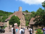 ●カイゼルスベルク '04年6月6日(日) ところで、カイゼルスベルクはノーベル平和賞を受賞したシュヴァイツァー博士の故郷とのこと。やはり美しい町並みであった。ガイドブックに寄ると、16世紀の祭壇彫刻が見事な教会があるらしいが、この時は行かなかった。ワインだけでいっぱいっぱいだったので・・・。ワイン専門店やお菓子屋さんが多く、ウィンドウショッピングをしているだけでも十分楽しめた。丘の上にお城があったので、もしかするとそこも見学できるのかもしれない。 |