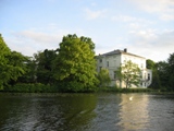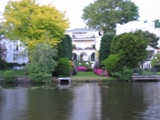 | 一応ワンドリンク付なのでゼクト(スパークリングワイン)をもらい、窓際の席に座る。この日の最終ということで、サービスなのか普段は行かない一角にも入ってくれた。特に素晴らしいお屋敷が多いところで、エリザベス女王(だったかな?)が泊まった建物もあるとのこと。運河に入ってもステキなお屋敷が見え隠れする風景が続く。ハウスボートではないんだけど、運河沿いに小さなかわいい家が続く地区があり、これも別荘なのかなあ、と思う。船内では、楽しそうな船長のアナウンスが流れる中(ドイツ語オンリー)、最近結婚した(する予定?)男性が、なんか余興みたいなことを始めて、みんなから祝福されていた。 | |||||||||