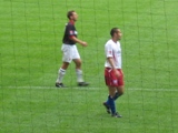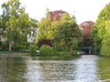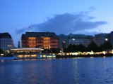 | 試合は、前半フランクフルトが先制点をあげたのだが、すぐにハンブルクに取り返され、後半は途中から出てきた高原選手のアシスト(と言っても、高原がシュートしたボールがバーに当たって、跳ね返ったところを仲間がうまくシュートしたんだけど)により、ハンブルクが更に一点追加。結局ハンブルクが2対1で勝ち、残念ながらフランクフルトは2部リーグ降格が決定したのだった。 ドイツで初めてのサッカー観戦であったが、お目当ての高原選手も出てくれたし、試合自体も大変面白かった。最初はちょっと観客の雰囲気が怖かったけど、「TAKAHARA!」などと声をかけてくれたりして、親しみやすい面があることもわかったし(笑)。サッカーはもう一回観れたらいいなと思う。今度はカーンの勇姿を見てみたい。 さて、帰りはシャトルバスを使わず、流れに任せて歩いていたら一つ先の駅に着いてしまった。でも、椅子に座ることができたので結果オーライ。次に目指すはアルスター湖遊覧船乗り場である。20:00発のだと、湖内遊覧だけでなく運河も巡ってくれる。本当は船に乗る前に食事を済ませたかったのだが、どこも一杯。仕方ないので、カフェでお茶して待つことにした。 |