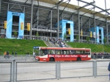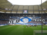 | 中央駅構内でも、応援歌を歌う軍団で騒がしい雰囲気だったのだが、Stellingen駅を降りると更に騒然としてきた。駅前のソーセージスタンドで、だんなは更にお腹を満たしたのだが、その間にかなり強い通り雨が降ったりして、パラソルの中は人でごったがえしていた。すぐに止んだから良かったけど不安定な天気である。駅からサッカー場はけっこう遠いので、途中でシャトルバスに乗る。それが、もうすごい人だかりで大混乱。みんなビール瓶片手に大騒ぎで、わーん、こわいよーっ。しかし、日本のラッシュアワーで鍛えられてもいる私達。なんとか、がんばって乗り込むことに成功した。乗ってみると案外余裕がある。次々とバスが来るというのもあるけど、やっぱり日本の満員電車って凄まじいんだなーと実感。バスの中でも地元のファンが応援歌を歌うと、相手側チームのファンがかぶせるように応援歌を歌い返して大騒ぎ。この日は今シーズン最後の試合で、相手側フランクフルトのチームは、これに勝たないと2部リーグに落ちてしまうという大事な試合。 そのためフランクからはかなりのファンが応援に駆けつけてきたのだった。 さて、無事サッカー場に到着し、半周以上して自分達のゲートにたどり着いた。私達の席は一階のかなり前でゴールの後ろ。たくさんパンが入った、でっかいバスケットを持って歩いている売り子のニイチャンを見てると、改めて「ドイツだわー」と思う(笑)。ビールはプファンドで、カップを返しに行くとお金が少し返ってくる。実は、寒くて本当はビールを飲むような状況ではなかったのだが、前半終了後にだんなが一杯だけ買いに行った。 | |||||||||