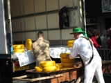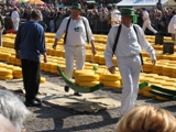 アムステルダムの北西に位置するアルクマールでは、4月中旬から毎金曜日にチーズの競り市が開催される。これが、この時期に旅行を決めた、もう一つの理由である。今度は屋内パーキングに車を停め、自転車に気をつけながら会場へ向かった。エダムチーズが一面に並べられた広場には、既にかなりの人だかりができていた。少しでも見やすい場所を求めて一周してみる。競り落とされたチーズを、運搬人のギルドがセッセと運び出していく。白い衣装に色とりどりの帽子をかぶった姿は、なかなか可愛かった。もしや木靴を?と思ったが、さすがに運動靴を履いていて、ちょっと残念。 |