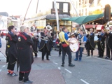 ●ハーレム2 '04年4月24日(土) 運河クルーズを満喫した後、トラムに乗って宿、いやマイカーまで戻った。そう。これから、フラワーパレードを見にハーレムへ向かうのである。これは、オランダの春を告げるメインイベントで、チューリップやヒヤシンスなどの春を代表する球根花で作られたカラフルな山車が、北海沿岸地方40kmを一日かけてパレードするというもの。最終地ハーレムへの到着は20時過ぎ。時間は、まだたっぷりある。一回訪れた街なので、どこに駐車すれば良いかわかっている。道路の混雑を覚悟していたのだが、拍子抜けするほどスムースに着いた。本当にやるんでしょうね、と不安になったが、メインストリートを警察が封鎖してたので間違いないようだ。道沿いのレストランでゆっくり食事をとりながら、パレードの到着を待った。隣に座った家族のお茶目な男の子の行動を微笑ましく眺めていると、ハーレムの楽隊が陽気な音楽を演奏し始めた。当たり前だが上手だなあと思う。パワフルだしね。 |