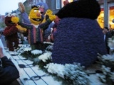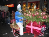 | さて、20時を大分過ぎた頃、やっと到着し始めた。ブラスバンドやバトンガールなどの行列の後、花で美しく飾られた山車が次々とやってくる。大きなオブジェにビッシリと花びらが飾られている様は植物虐待という感じもあるが(苦笑)、ここは単純に見惚れることにした。山車は市内を練り歩き、何日か古運河沿いに展示されるとのこと。たまに、チョコッと花で飾った程度の車が混じったりして不思議だったのだが、これは山車に乗っていた人たちの、帰りの交通手段ではないかと、だんなが推察していた。そして車に戻る途中、運河沿いの道にたくさんそんな車が駐車されていたのだった。 |