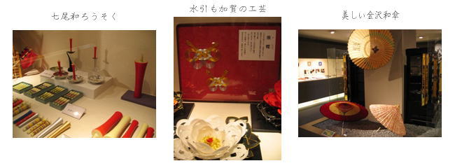 ●石川県立伝統産業工芸館 次に、伝統産業工芸館に入る。全部で36業種もあるらしい。無料のオーディオガイドを借り、結構丹念に見て行った。代表的な加賀友禅や九谷焼、輪島塗や山中漆器、金沢箔(金箔)などの他に、ろうそくや和傘、仏壇や三味線、提灯など盛りだくさん。釣り道具の竿や加賀毛針というのもある。今は、この毛針の技術を使ったアクセサリーなどもあって面白い。職人の技がギュッと詰まったオススメの工芸館である。 |