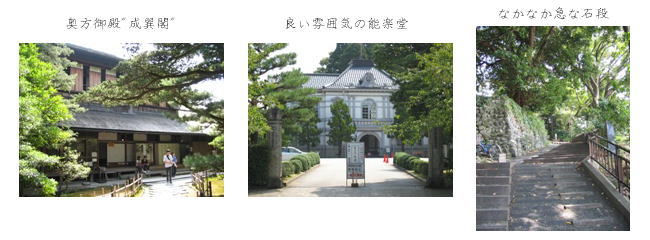 | 工芸館の次は、隣にある成巽閣(せいそんかく)へ。加賀前田家奥方御殿で、確か大正天皇もお使いになったことがあるそうである。これまたステキな数々の照明器具は、その当時(大正時代)のものだと聞いた気がするが、ちょっと記憶が曖昧(苦笑)。謁見の間の欄間の透かし彫りが見事で見とれてしまった。また、ティムール帝国から贈られた絨毯が敷き詰められいるのも面白い。障子の腰板には部屋によって違う絵が描かれており、それが部屋の名の由来になっていたりする。内部の撮影が禁止だったのは残念だったが、とにかく凝ったつくりで、予想以上に楽しかった。 | |||
