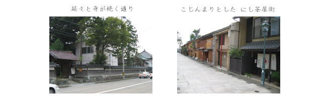 ●寺町、にし茶屋街 情緒あるW坂を上り、寺社が延々と立ち並ぶ寺町を歩く。中には特別入らなかったが、その町並み自体が壮観ではある。日蓮宗ばかりだったが、檀家はそれぞれ、どうやってこんなたくさんのお寺さんの中から自分の寺を選ぶのかと、ふと思う。にし茶屋街の近くにある妙立寺が忍者寺として有名なようだが、予約が必要らしいので、そのままパス。やっと着いたにし茶屋街は、ひがし茶屋街より規模が小さく、時間帯もあるのか、ひっそりとしていた。 |