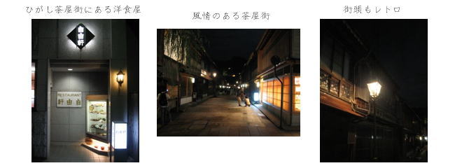 ●ひがし茶屋街、金沢城 入浴後、部屋でまったりしてから再び出かけた。夜のひがし茶屋街を見に、バスを乗り継いで行く。角にある洋食屋「自由軒」に入り、まずは腹ごしらえ。人気のオムライスを食べた後、茶屋街の中を散歩する。翌日が中秋の名月ということで、ほぼ満月のお月様が朧に浮かんで美しい。役者が揃った茶屋街を、うっとりしながら歩いたのだった。 |