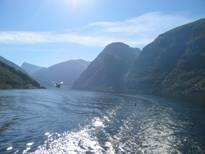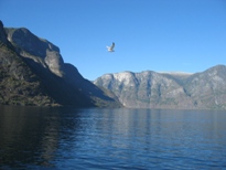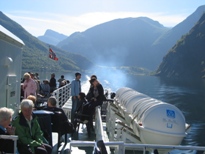 | 無事フィヨルドの玄関口であるフロムに到着し、今度はフェリーに乗り換えた。ソグネフィヨルドは世界一長くて深いフィヨルドだが、観光ポイントは最奥部で枝分かれしたナールオイフィヨルドと、ここアウランフィヨルドである。8月でも寒いと聞いていたので、防寒対策は万全だ。が、穏やかに晴れていたので、思ったほど寒くはなかった。良い気持ちでデッキから景色を眺める。 |