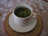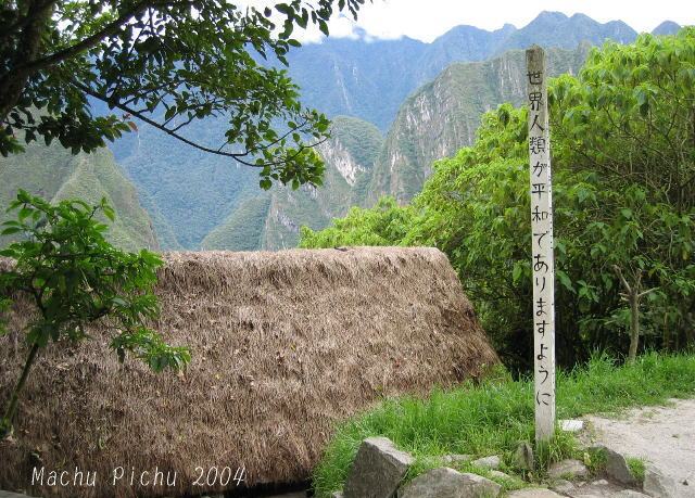 ●マチュピチュ1 '04年12月26日(日) カフェで食事中、一匹の犬がウロウロしながらオコボレをねだるので、パンの切れ端をいくつか投げてやった。 さて、食事が済んで一服した後、バスに乗って麓まで戻った。そうそう。昔は、つづら折りの道を行くバスよりも早く麓に降りて、乗客からチップをもらっていた「グッバイボーイ」という少年がいたらしいが、教育上よろしくないということで、今は止めさせたそうである。それまでは先輩から後輩へ、代々引き継がれていたというから恐れ入る。バスを降りたところからは、お土産屋がひしめく中を歩かないと駅に辿り着けなかった(苦笑)。リャマと同じような容姿をした、アルパカという動物の毛で作ったブランケットを、10ソル(約3ドル)まけてもらって70ソルで購入。まだ時間があったので、川沿いのお店に入ってコカ茶を飲んだ。ここは、お湯にコカの葉をたくさん入れた形で出てきた。お皿で蓋をして、少し蒸らしてから飲む。緑茶に、何か他のハーブを混ぜたような味がする。日本人の口には合いやすいと思う。ペルー名物の飲み物としては、後一つ「インカコーラ」というのもある。甘くてさほど美味しいものではないが、これもペルーでしか飲めないので、私はずっと暖かい飲み物はコカ茶、冷たい飲み物はインカコーラを注文していた。 |